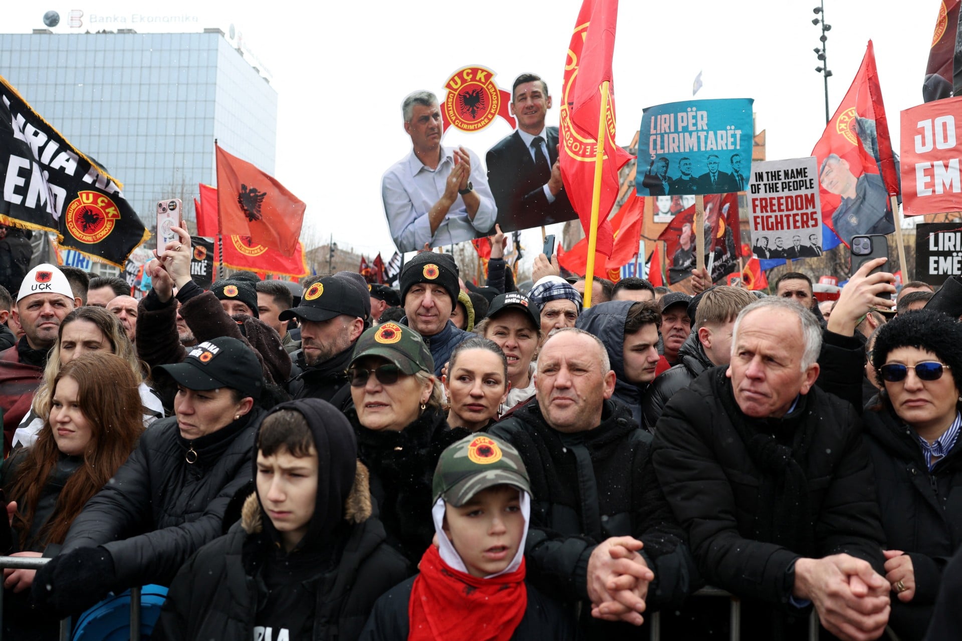 Veel demonstranten droegen KLA-uniformen, anderen zwaaiden met KLA-, Kosovo- en Albanese vlaggen. Supporters hielden borden vast met de tekst “Vrijheid heeft een naam” en foto’s van Thaci en anderen met de tekst “Heroes of War and Peace”. Thaci, 57 jaar oud, was tussen 2008 en 2020 premier, minister van Buitenlandse Zaken en president van het onafhankelijke Kosovo.
