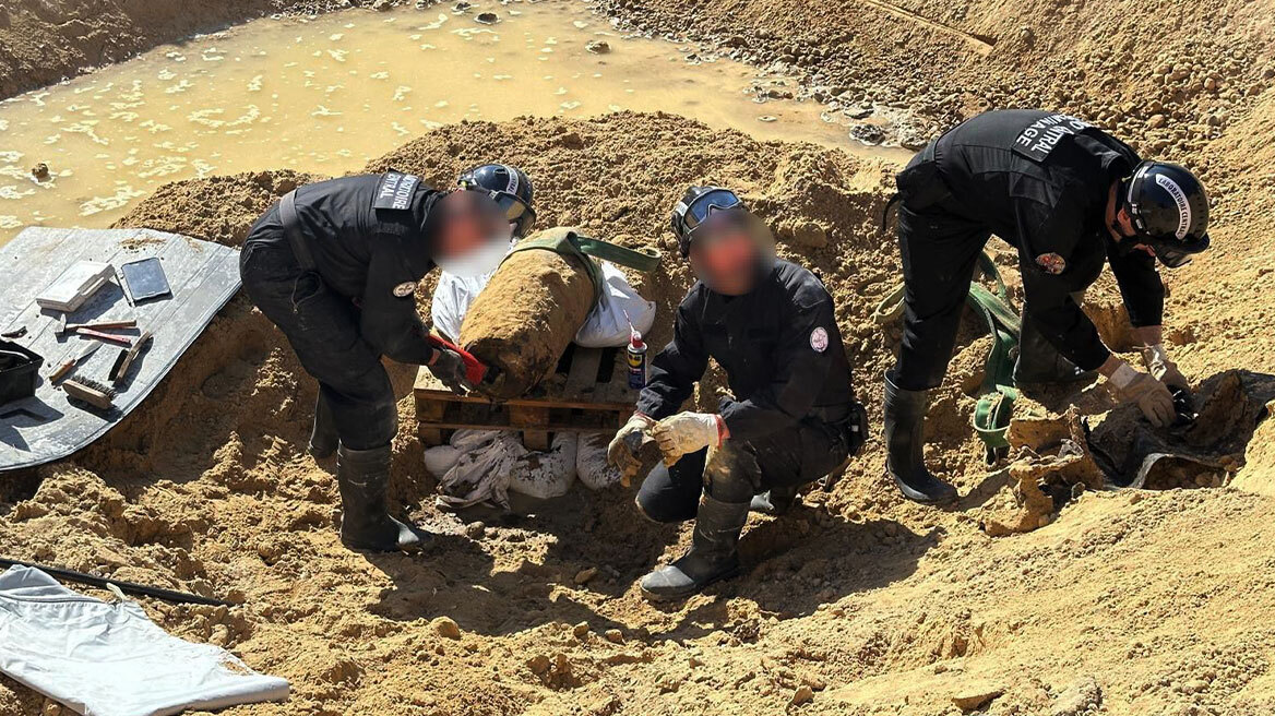 Beelden uit het bedrijf lieten het zware, verroeste metalen relikwie op de bodem van een zandgroeve zien, stevig op zijn plaats gehouden door dikke, ruwe houten balken ingebed in betonnen muren. Uitgebreide dekkingswerkzaamheden waren nodig om de explosie te beperken.
